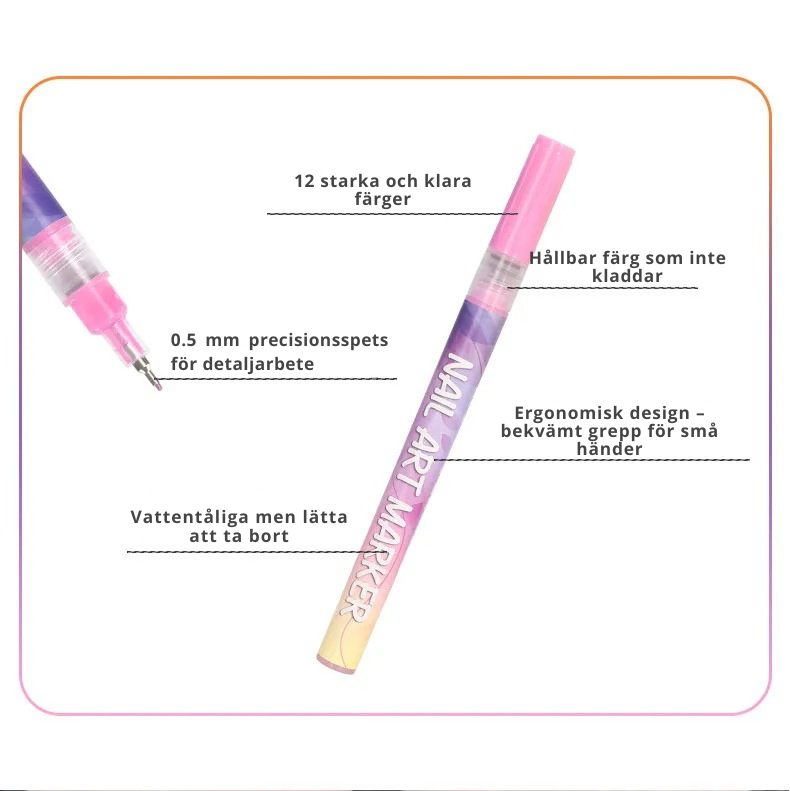Våra 12-Färgs Nagelkonstpennor är den perfekta kombinationen av kreativitet, lek och kvalitet – skapade för barn som älskar att pyssla, måla och uttrycka sig.